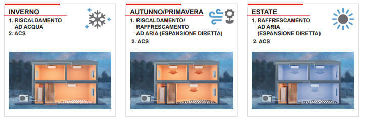 Pompa di calore con impianto multisplit ad aria per riscaldamento e raffrescamento e impianto ad acqua per riscaldamento e produzione acqua calda.
